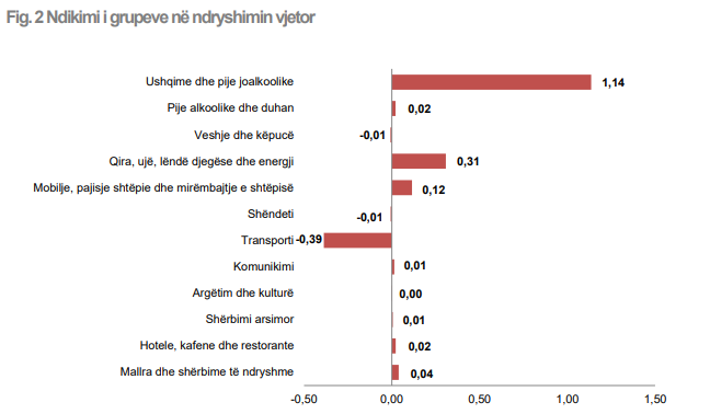 Çmimet e grupeve “Komunikimi” dhe “Shërbimi arsimor” kanë kontribuar me +0,01 pikë përqindje secili. Çmimet e grupit “Transporti” kanë kontribuar me -0,39 pikë përqindje.