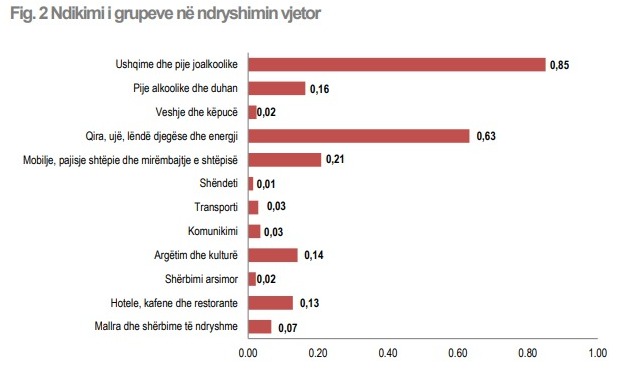 Në raport mujor, korrik-gusht, shifrat tregojnë një rritje më të vogël të çmimeve të grupit qira dhe energji, 0.5%, njësoj sa edhe çmimet e sektorit të argëtimit e kulturës dhe hotelerisë e bar-restoranteve. Grupi i mobiljeve e pajisjeve shtëpiake u shtrenjtua me 0.4%,ndërsa ushqimet, pijet alkoolike/joalkoolike dhe duhani me 0.3%.