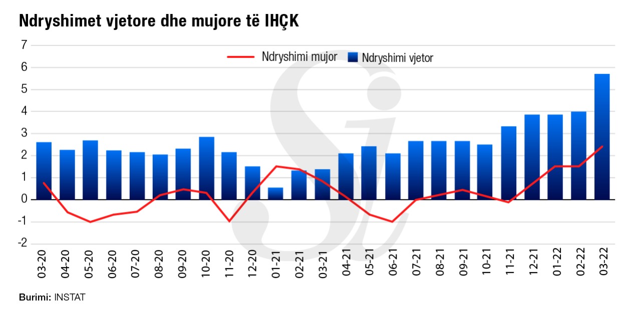Më së shumti ai u ndikua nga çmimet e transportit me 12.8% dhe të ushqimeve me 9.3%. Në mars, inflacioni i matur nga INSTAT rezultoi po 5.7%. Ky është niveli më i lartë që prej vitit 2002 dhe është shumë më i lartë se objektivi prej 3% i vendosur nga Banka e Shqipërisë.