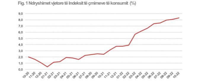 Inflacioni në Shqipëri për muajin tetor arriti në 8.3%, ndikuar nga rritja e grupit të transportit dhe nga rritja e grupit të ushqimeve dhe pijeve joalkoolike.