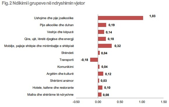 Në raport mujor, rritjen më të fortë të çmimeve e kishte grupi i pijeve alkoolike dhe duhanit, me 1.1%, pasuar nga grupet “Mobilje, pajisje shtëpie dhe mirëmbajtje e shtëpisë” me 1%, “Ushqime dhe pije joalkoolike” me 0.9 %, “Transporti” me 0.6%.