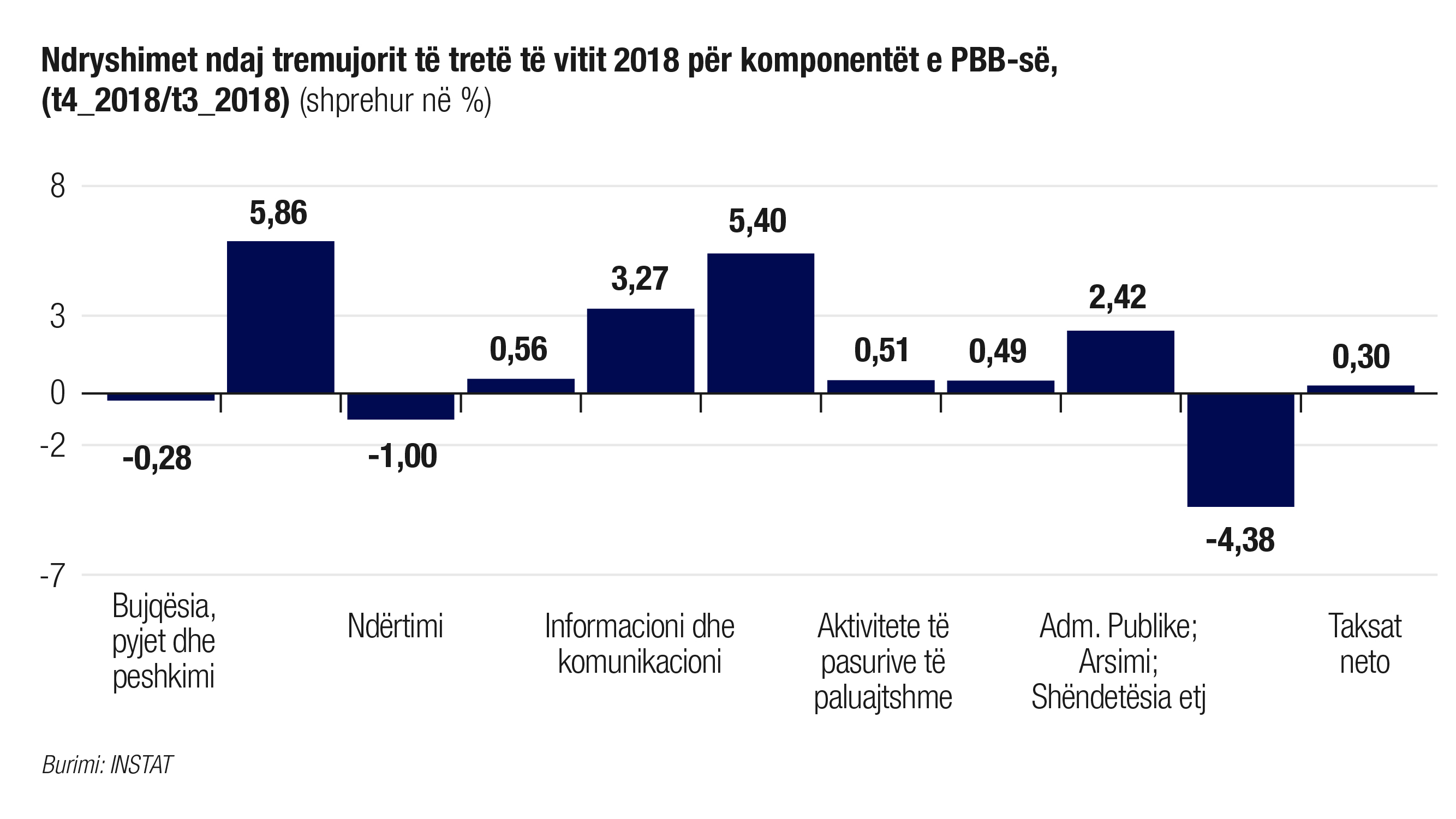 Në tremujroin e katërt 2018 krahasimisht me një tremujor paraardhës, sipas të dhënave zyrtare të INSTAT rritja ekonomike ka shënuar 0,57% . Prodhimi i Brendshëm Bruto në tremujorin e tretë ka rezultuar 1,09 % dhe tremujorin e dytë është vlerësuar me një rritje prej 1,34 %.