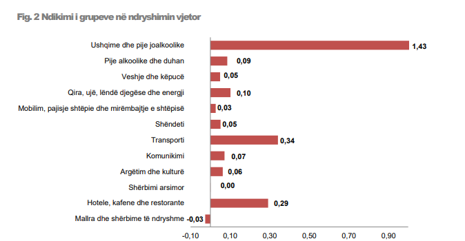 Indeksi i Harmonizuar i Çmimeve të Konsumit në vend është ndikuar më së shumti nga ushqimet dhe pijet joalkoolike dhe transporti me 3.9%. Komunikimi me 3%, argëtimi dhe kultura me 2.3%, hotele, kafene dhe restorante me 2%. Veshje dhe këpucë me 1.2%, shëndeti me 1%, mobilim, pajisje shtëpie dhe mirëmbajtje me 0.4%.