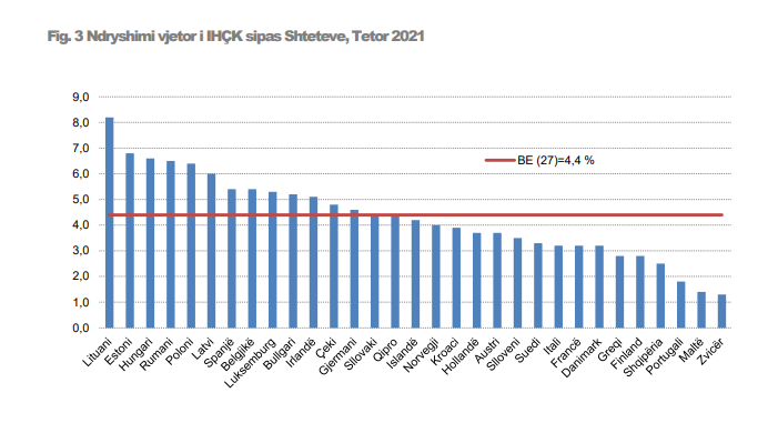 Rritja e çmimeve në të gjithë botën, ka prekur në nivel më të ulët Shqipërinë, ku sipas inflacionit me metodën e Eurostat, në tetor pati 2.5% rritje, ndër nivelet më të ulëta në Europë. Rritja e përgjithshme e çmimeve në Europë për muajin tetor ishte 4.4%.