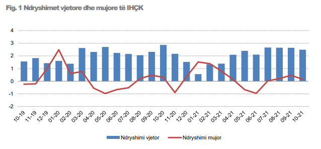 Në muajin Tetor 2021, ndryshimi mujor i matur nga Indeksi i Harmonizuar i Çmimeve të Konsumit është 0.2 %. Ky ndryshim është ndikuar kryesisht nga rritja e çmimeve të grupit transporti me 1.2 %, pasuar nga grupi qira, ujë, lëndë djegëse dhe energji me 0.7%, pije alkoolike dhe duhan, veshje dhe këpucë dhe argëtim dhe kulturë me 0.3% secili, komunikimi me 0.2 %.