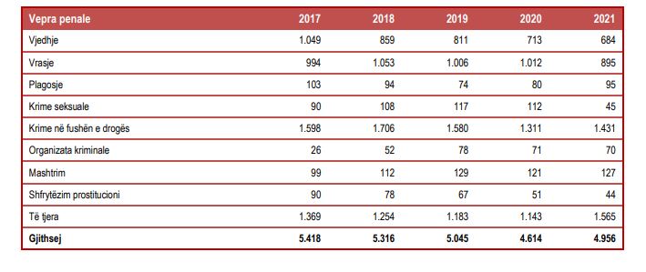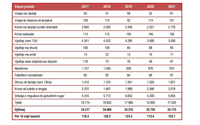 Të dhënat tregojnë se janë regjistruar 61 vrasje me dashje. Më tej në raportin e INSTAT thuhet se gjatë vitit 2021 janë evidentuar gjithsej 35.175 vepra penale, 7,5 % më shumë, krahasuar me vitin 2020.
