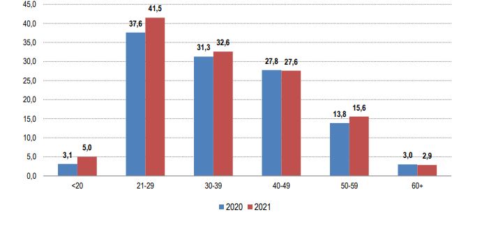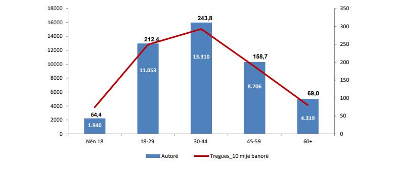 Lidhur me moshën e autorëve, sipas të dhënave të INSTAT përgjatë vitit 2021 më të përfshirë në botën e krimit është grup mosha 30-44 vjeç.