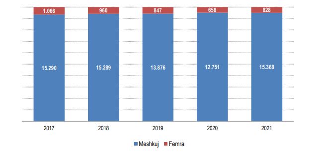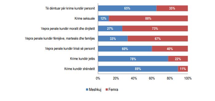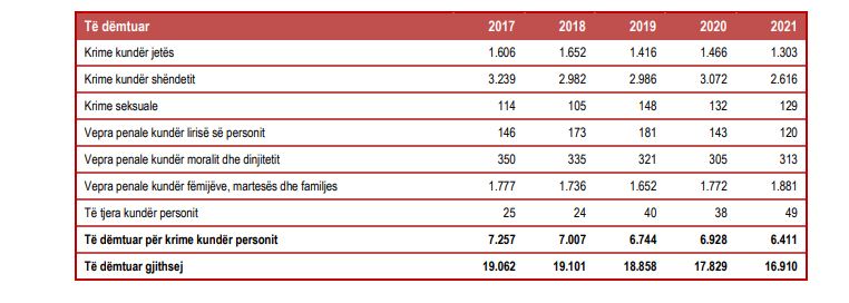 Në vitin 2021, në totalin e të dëmtuarve për krime kundër personit, femrat përbëjnë 27,8 % të të dëmtuarve dhe përqindja më e madhe e tyre vihet re në krime seksuale, krime kundër moralit dhe dinjitetit si edhe krime kundër fëmijëve, martesës dhe familjes.