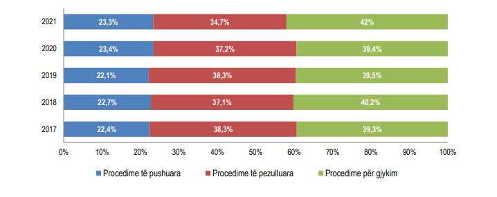 Në vitin 2021, numri i procedimeve penale të regjistruara është 28.349 ose 1,8 % më shumë, krahasuar me vitin 2020. Nga 25.688 procedime penale të përfunduara, 23,3 % e tyre janë pushuar, 34,7 % janë pezulluar dhe 42 % janë dërguar për gjykim në gjykatë.