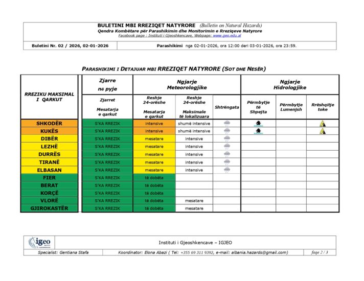 Sipas IGJEO, nesër (e shtunë, 3 janar) priten reshje me intensitet të lartë, kryesisht në veri dhe qendër të vendit. Në qarqet Shkodër dhe Kukës mund të ketë vërshime të shpejta të lumenjve të vegjël malorë dhe rrëshqitje dherash.
