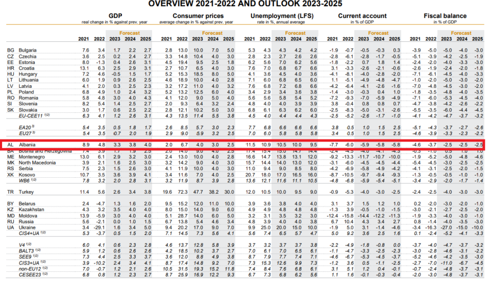 Ekonomitë e Ballkanit Perëndimor do të rriten mesatarisht me 2%, dhe Turqia me një ritëm disi më e fortë 2.6%. Edhe pse rritja do të jetë shumë më e ulët se vitin e kaluar në shumicën e vendeve një recension i plotë do të shmanget më 2023.