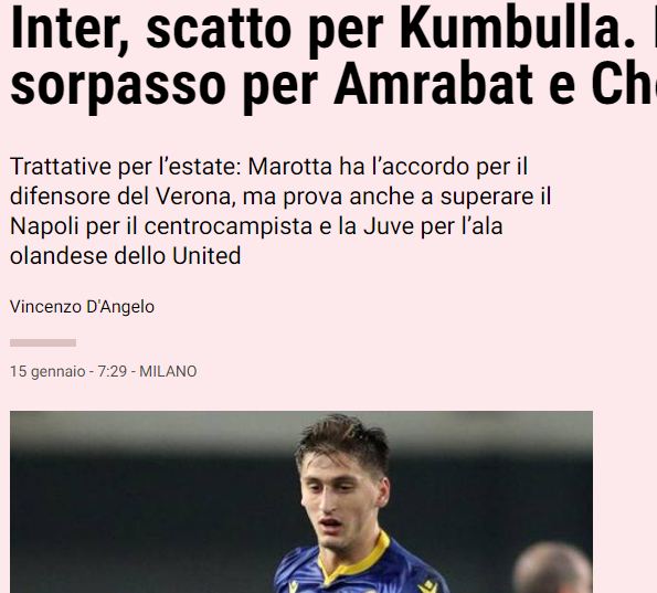 Sipas prestigjiozes italiane “La Gazzetta dello Sport”, emri më i nxehtë në këtë moment është ai Marash Kumbullës, mbrojtësit shqiptar të Veronës. Xhuzepe Marota, administratori i Interit, ka intensifikuar përpjekjet për mbrojtësin e ri, emri i të cilit figuron si një objektiv i klubeve më të mëdha në Itali, Angli dhe Gjermani. Xhani Vitali, agjenti i lojtarit, takoi dje drejtuesit e Veronës për ta pasur më të qartë situatën. Kumbulla i pëlqen shumë Interit edhe për përshtatjen taktike, ai është vërtet një lider në mbrojtjen me tre, kështu që nuk do të kishte asnjë problem të futej në mekanizmin e Kontes.