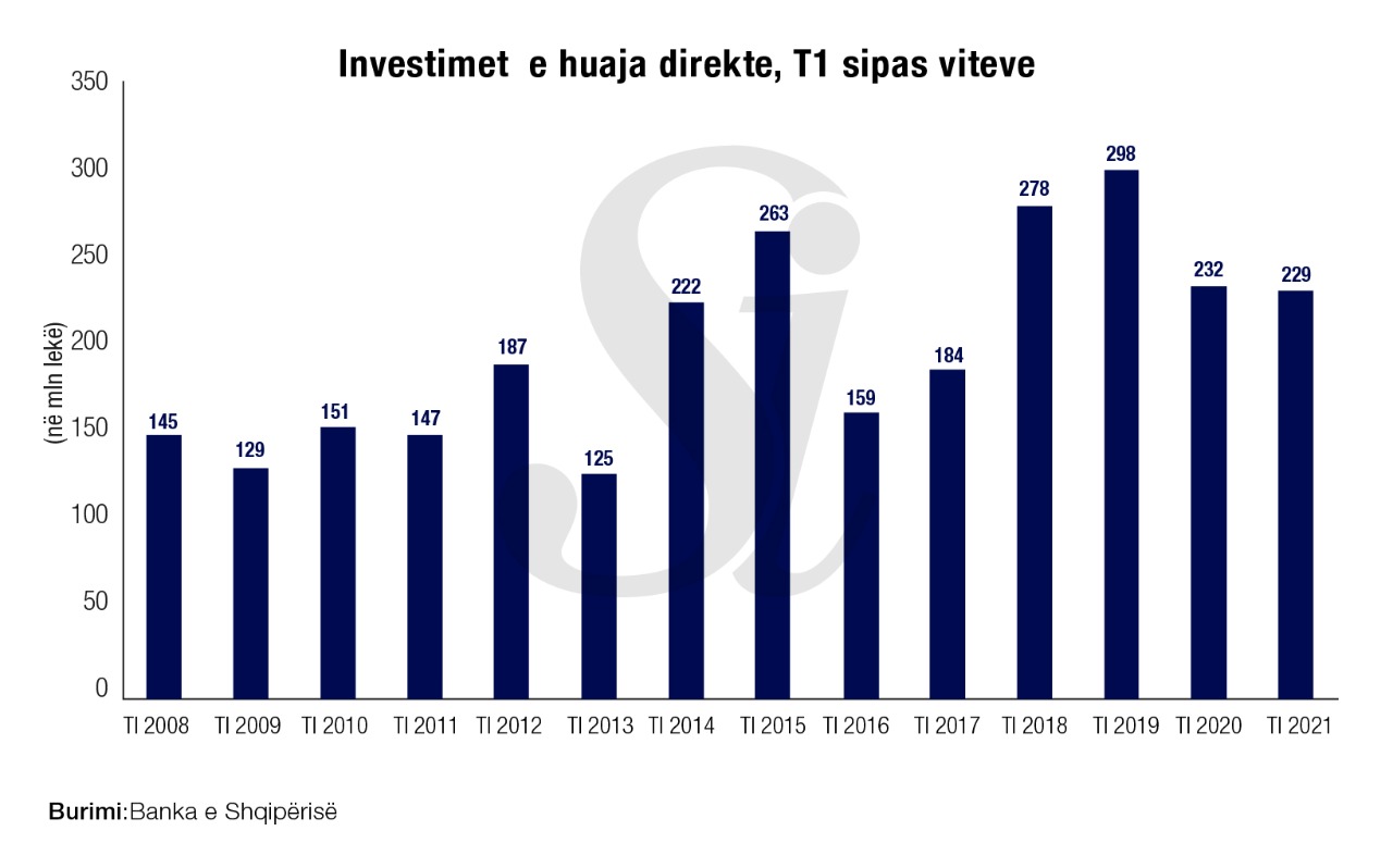 Investimet e huaja për periudhën janar-mars 2021 arritën në vlerën e 229 milionë eurove, 3 milionë euro më pak se janar-mars 2020, duke shënuar dhe nivelin më të ulët të investimeve të huaja në vend që nga viti 2017.