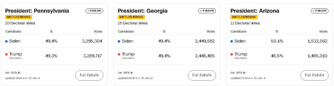 Pesë shtetet e tjera ku ende vazhdon numërimi, Alaska, Arizona, Xhorxhia, Nevada dhe Karonalina e Veriut, janë ende të lëkundura. Trump kryeson në Alaskë dhe Karolinën e Veriut, ndërsa Biden ka kryesuar në Arizona, Xhorxha dhe Nevada.