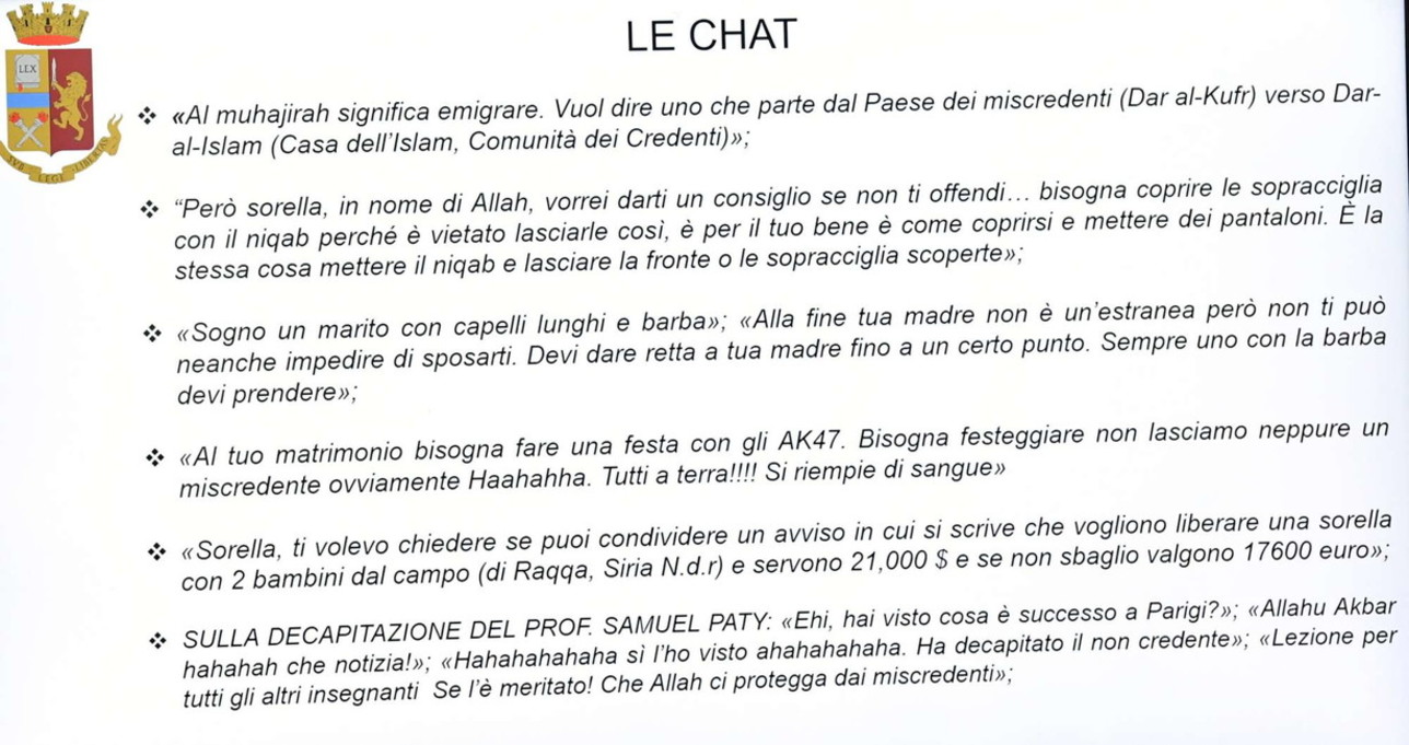 Për hetuesit, gruaja është “një mbështetëse e zjarrtë e ISIS”. E radikalizuar që në moshën 16-vjeçare, ajo kohët e fundit ishte shpërngulur nga Kosova në Milano, me vëllain e saj, duke qenë në kontakt të vazhdueshëm me bashkëshortin e saj dhe me diasporën kosovare të frymëzuar nga xhihadistët.