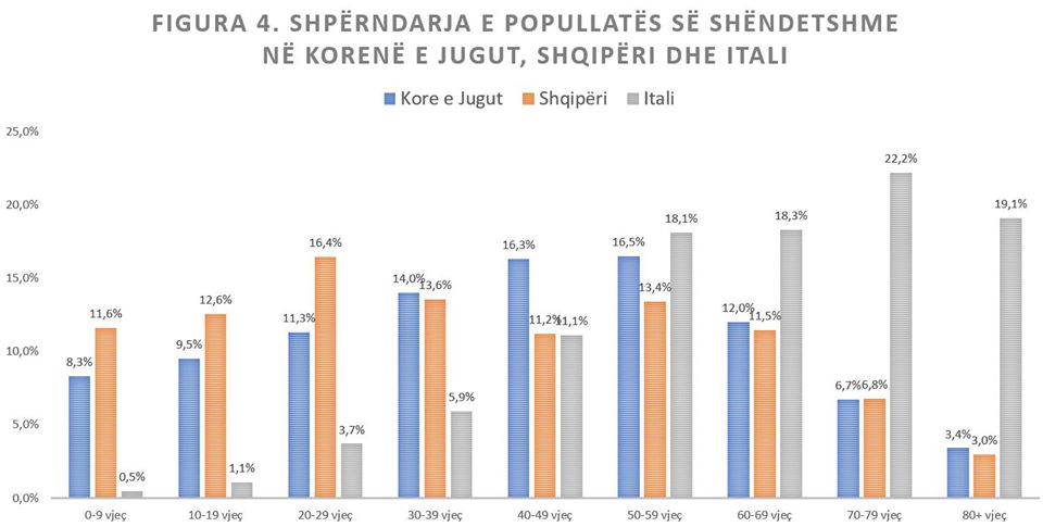 ? Figura nr. 4 tregon shpërndarjen e moshës së popullatës shqiptare në krahasim me Korenë e Jugut dhe me Italinë. Të dhënat janë marrë nga United Nations World Population Prospects 2019