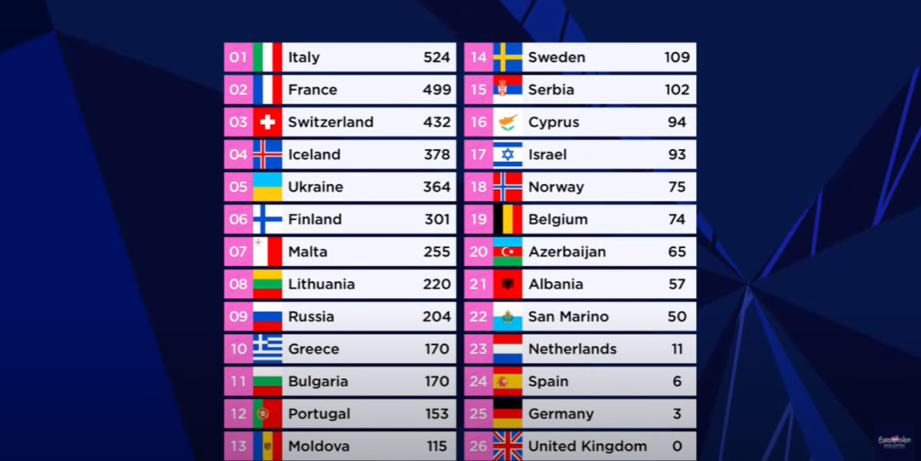 Ndërkohë Anxhela Peristeri me gjithë performancën skenike mbresëlënëse ka marrë vetëm 57 pikë në renditjen tabelare, duke u renditur në vend të 21-të.
