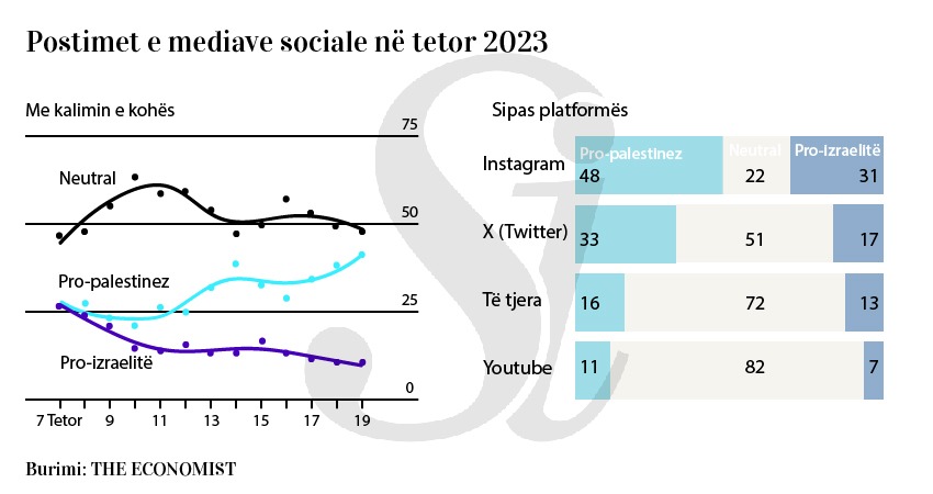 Një sondazh me amerikanët nga YouGov gjeti tre mbështetës të Izraelit për çdo mbështetës palestinez më 20 tetor – me dy herë më shumë postime pro-palestineze në një ditë në mediat sociale amerikane.