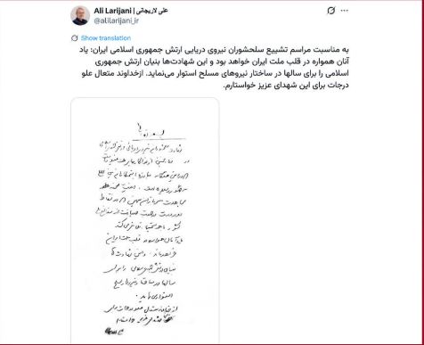 Nga Gazeta ‘Si’- Edhe pse Izraeli pretendoi se sekretari i Këshillit Suprem të Sigurisë Kombëtare të Iranit, Ali Larijani, është vrarë gjatë natës së kaluar, media shtetërore iraniane ka publikuar një shënim që thotë se është shkruar nga Ali Larijani.