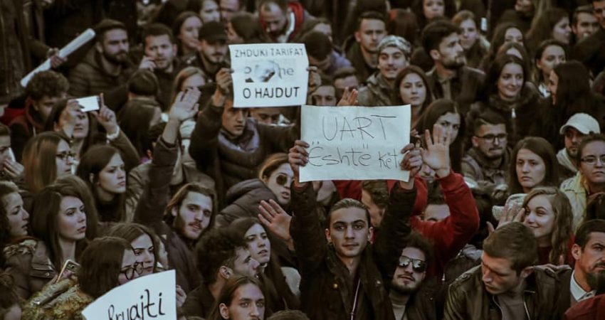 Një prej mbrëmjeve, në sheshin mes dy godinave – asaj të Teatrit Kombëtar, që duke nisur nga ky sezon nuk i çeli më dyert as për premiera e as për publikun dhe Teatrit Eksperimental, që vijon punën normalisht, me të dy sallat funksionale. Nuk bën habi të shohësh që thuajse i gjithë ai komunitet artistësh që protestonin më herët për Teatrin, janë radhitur si mbështetës të protestës së studentëve, të cilët e nisën duke kërkuar fillimisht heqjen e tarifës për provimet e mbartura, më pas në përpilimin e tetë pikave kyçe, ku të rinjtë e sistemit shqiptar të arsimit të lartë shohin problemet më të mëdha e deri tek shfuqizimi i ligjit për arsimin e lartë.