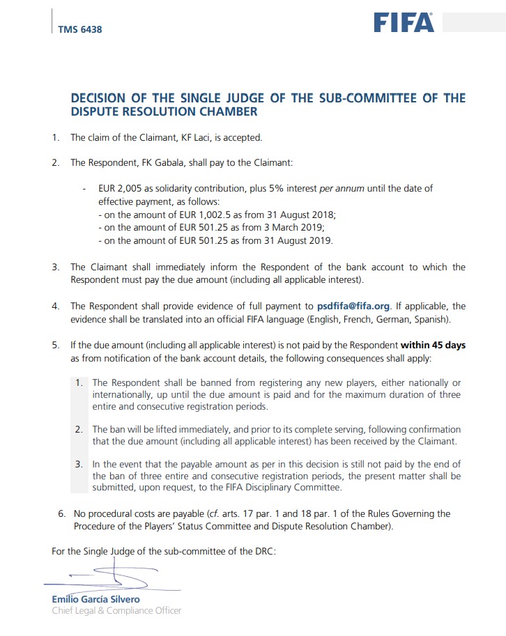 Vendimin i Nënkomisionit të Dhomës së Zgjidhjes së Konflikteve të FIFA-s për çështjen Ref. Nr. TMS 6438, që i përket KF Laçi kundër FK Gabala në lidhje me transferimin e lojtarit Segun James Adeniyi.