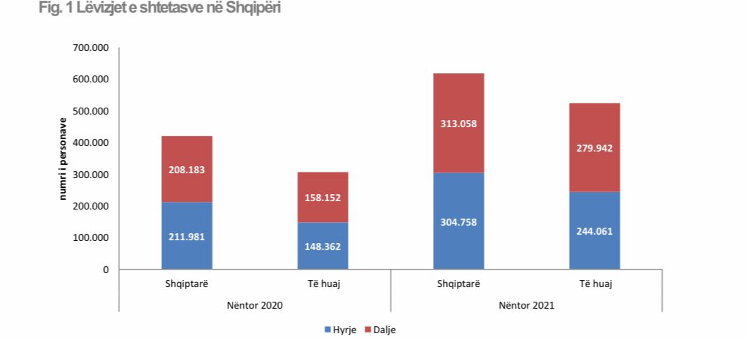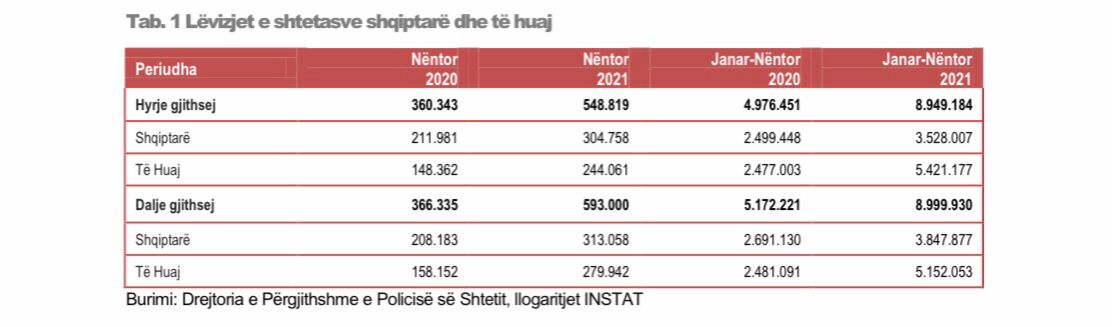 Daljet e shtetasve shqiptarë dhe të huaj nga territori i Shqipërisë, gjatë muajit Nëntor 2021, janë 593.000 duke shënuar një rritje me 61.9%, krahasuar me të njëjtën periudhë të një viti më parë.