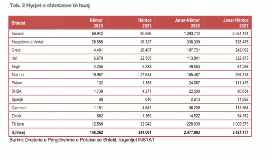 Në nëntor, në vend hynë gjithsej 244 mijë shtetas, me rënie prej 9% në krahasim me nëntorin e 2019-s. Krahas Kosovës, (+23%), për herë të parë që nga pandemia, në vend hynë më shumë shtetas nga Maqedonia e Veriut (+19%). Në rritje ishin dhe polakët (+57%), ndonëse numri i tyre mbetet i ulët në krahasim me vendet fqinjë (gati 80 herë më pak se hyrjet nga Kosova psh). Në rritje të lehtë ishin hyrjet nga Zvicra (5%), Gjermania (5%).