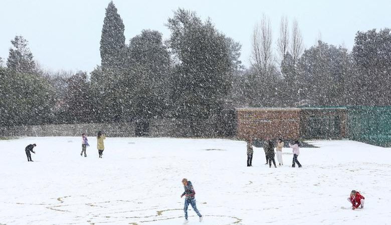 Fëmijët luajnë në dëborë në Laerskool Orion, një shkollë e vendosur në Brackenhurst, një periferi në jug të Johannesburg, Afrika e Jugut, 10 korrik.
