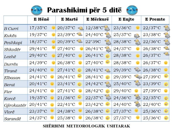 Shërbimi Meteorologjik Ushtarak njofton se këtë javë vendi ynë pritet të ndikohet nga kushte atmosferike të qëndrueshme, si rezultat i masave të ajrore të nxehta. Kjo falë ndikimit të rrymave ajrore të nxehta me origjinë nga veriu i Afrikës dhe Anticiklonit të Azoreve, ditë të nxehta e net të ngrohta (netët Tropikale).