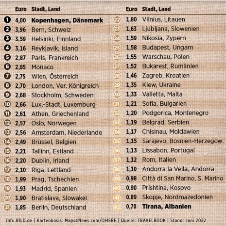 Ndërsa në Tiranë, një filxhan kafeje ka çmimin më të lirë, mesatarisht 0.70 cent, pra 3.30 euro më pak se në Kopenhagën i cili konsiderohet si kryeqyteti i “kafesë së shtrenjtë”.