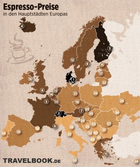 Sipas studimit, çmimet më të larta të kafeve janë në Danimarkë ku kafeja mesatarisht kushton 4 euro, Zvicër 3.96 euro më tej në Islandë, Paris, Vjenë e Londër.