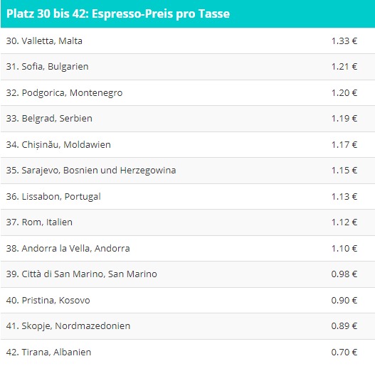 “Prandaj, çmimet janë të ulëta, pasi kafeja, ekspresi dhe moka janë pjesë integrale e jetës së përditshme. Shqipëria dhe Maqedonia e Veriut zënë dy vendet e fundit si në Indeksin e Ekspresit ashtu edhe në GDP.