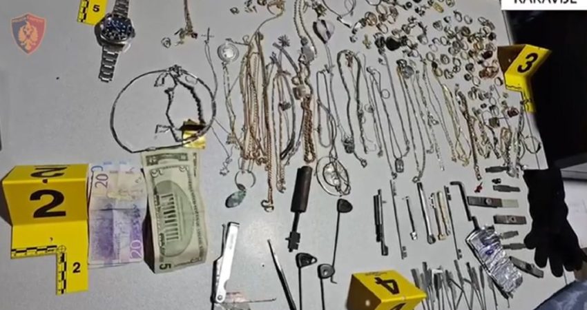 Sendet e sekuestruara nga policia janë 50 unaza, 21 varëse floriri, 12 varëse argjendi, 13 byzylykë floriri, 6 byzylykë argjendi, 53 vathë floriri, 32 medalione, 2 monedha floriri, 1 orë e markës “Rolex”, 1 varëse me perla dhe çelsa për hapjen e dyerve dhe kasafortave.