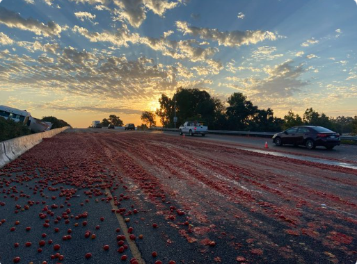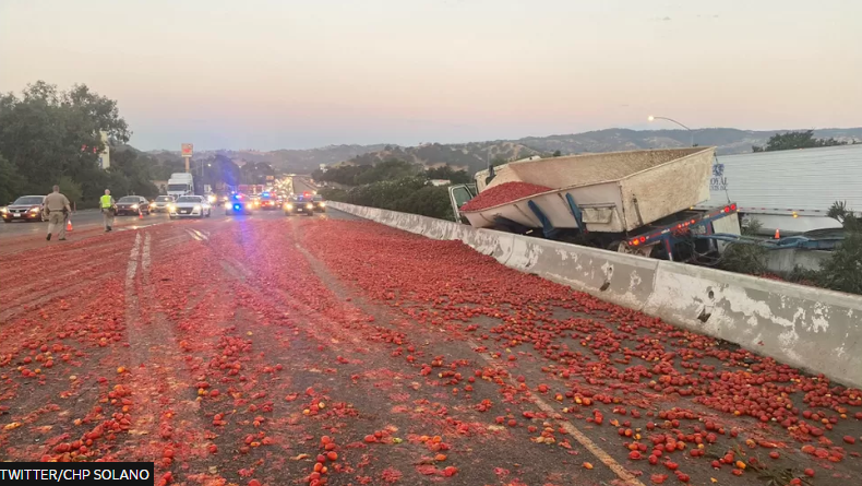 Një kamion ka derdhur më shumë se 150,000 domate në një autostradë në shtetin amerikan të Kalifornisë, duke e ndalur trafikun.