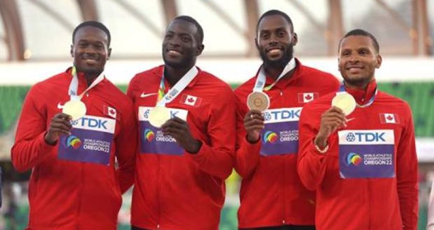 Andre De Grass, Aaron Brown, Jerome Blake dhe Brendon Rodney, fituesit e stafetës për Kanadanë. Gazeta Si, 24 korrik 2022