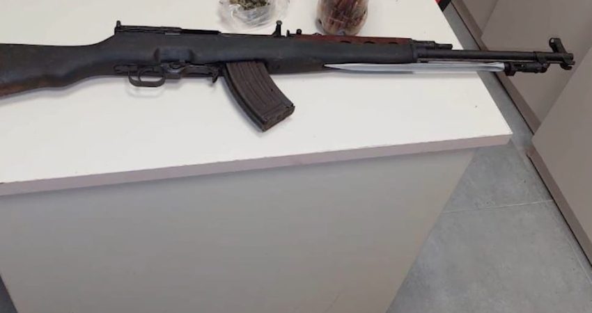 Në cilësinë e provës materiale u sekuestruan arma e zjarrit pushkë, disa fishekë luftarak dhe një sasi lënde e dyshuar narkotike cannabis sativa që u gjetën në banesën e 29-vjeçarit.