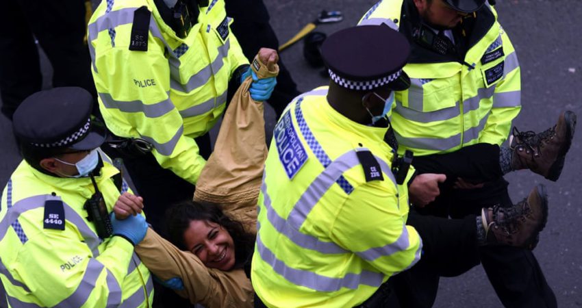 Në foto, katër policë duke zhvendosur një protestuese pasi ka bllokuar rrugën gjatë një demonstrate për mbrojtjen e klimës në Tower Bridge.