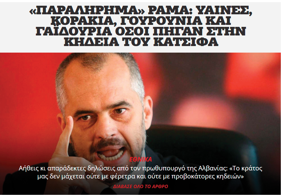 “Deklaratë joetike e Edi Ramës. Korban, derra dhe gomerë që shkuat në funeralin e Kaçifas; shteti ynë nuk lufton me arkmorte dhe as me provokatorë varrimesh”. Kështu e interpreton portali newsbomb.gr këtë deklaratë, ku në brendësi të lajmit, nëse mund të quhet i tillë flet për “grekë që kënduan këngë patriotike dhe përcollën për në banesën e fundit, Nikos Kaçifasin. Pra, për këtë media greke, sloganet “Vritini qentë shqiptarë” dhe mbishkrimet “Vorio Epiri është Greqi” janë “patriotike”.