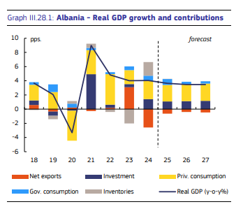 Rritja e qëndrueshme e pagave do të vazhdojë, duke mbështetur konsumin e fuqishëm privat. Pas përmirësimeve të konsiderueshme në pozicionin e jashtëm në vitet e fundit, deficiti i llogarisë rrjedhëse parashikohet të zgjerohet pak nga 2.4% në vitin 2024 në nën 3%, i nxitur nga një rritje e deficitit tregtar të mallrave. Eksportet vazhdojnë të mos kompensojnë deficitin tregtar, duke mbetur një pikë e dobët për ekonominë.