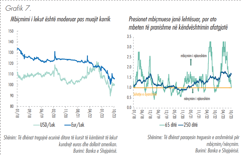 Në tregun valutor, luhatshmëria dhe pasiguria e shtuar që karakterizuan muajin korrik janë reduktuar dhe kursi i këmbimit kundrejt euros është luhatur në një interval gjithnjë e më të ngushtë gjatë periudhës gusht – tetor, thekson Banka.