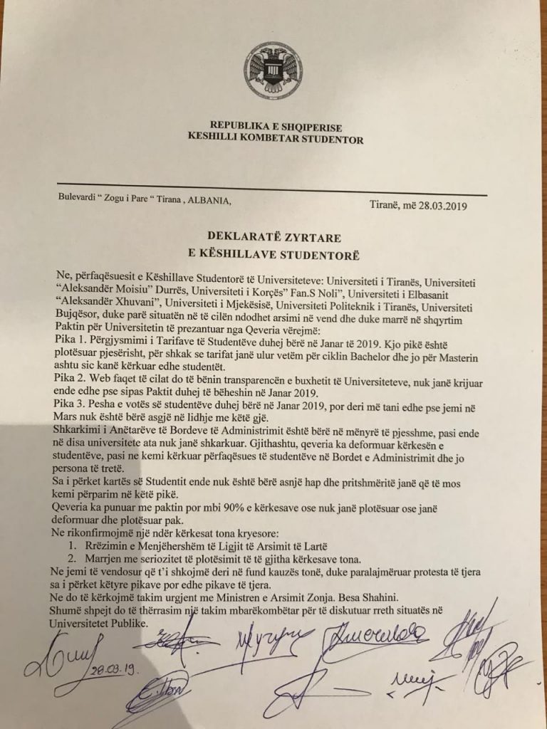 Një përfaqësi e këshillave studentorë të Universitetit të Tiranës, “Aleksandër Moisiu” në Durrës, Fan Noli i Korcës, Aleksandër Xhuvani i Elbasanit, Universiteti i Mjekësisë, Universiteti Politeknik i Tiranës dhe Universiteti Bujqësor përmesnjë deklarate informojnë se kanë marrë në shqyrtim paktin për Universitetin të prezantuar nga Qeveria dhe kanë vërejtur se nuk janë plotësuar kërkesat.