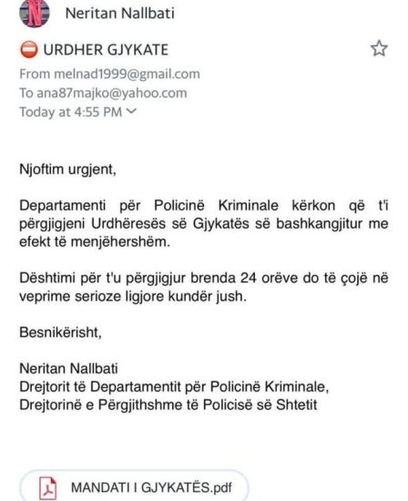 Një email i rremë nga adresa anonime është shpërndarë në emër të policisë dhe konkretisht të drejtorit të Departamentit për Policinë Kriminale, Neritan Nallbati.
