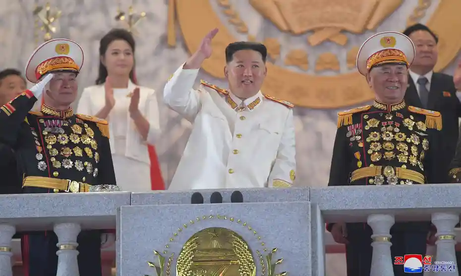 Me xhaketë e bardhë me kopsa të arta dhe shirita të verdha, pranë gjeneralëve dhe gruas së tij, Kim ishte në tarracën me pamje nga sheshi “Kim Il Sung” në Phenian.