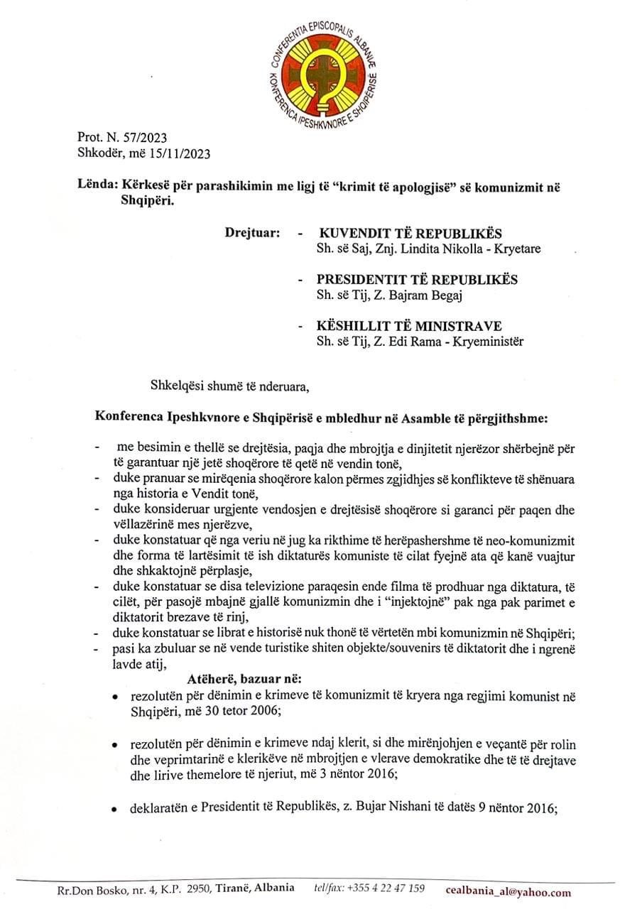 Në Konferencën Ipeshkvnore të Shqipërisë, Monsinjor Angelo Massafra ka kërkuar nga institucionet hartimin dhe miratimin e një ligji që ndalon përhapjen e simboleve e parimeve të diktaturës komuniste.