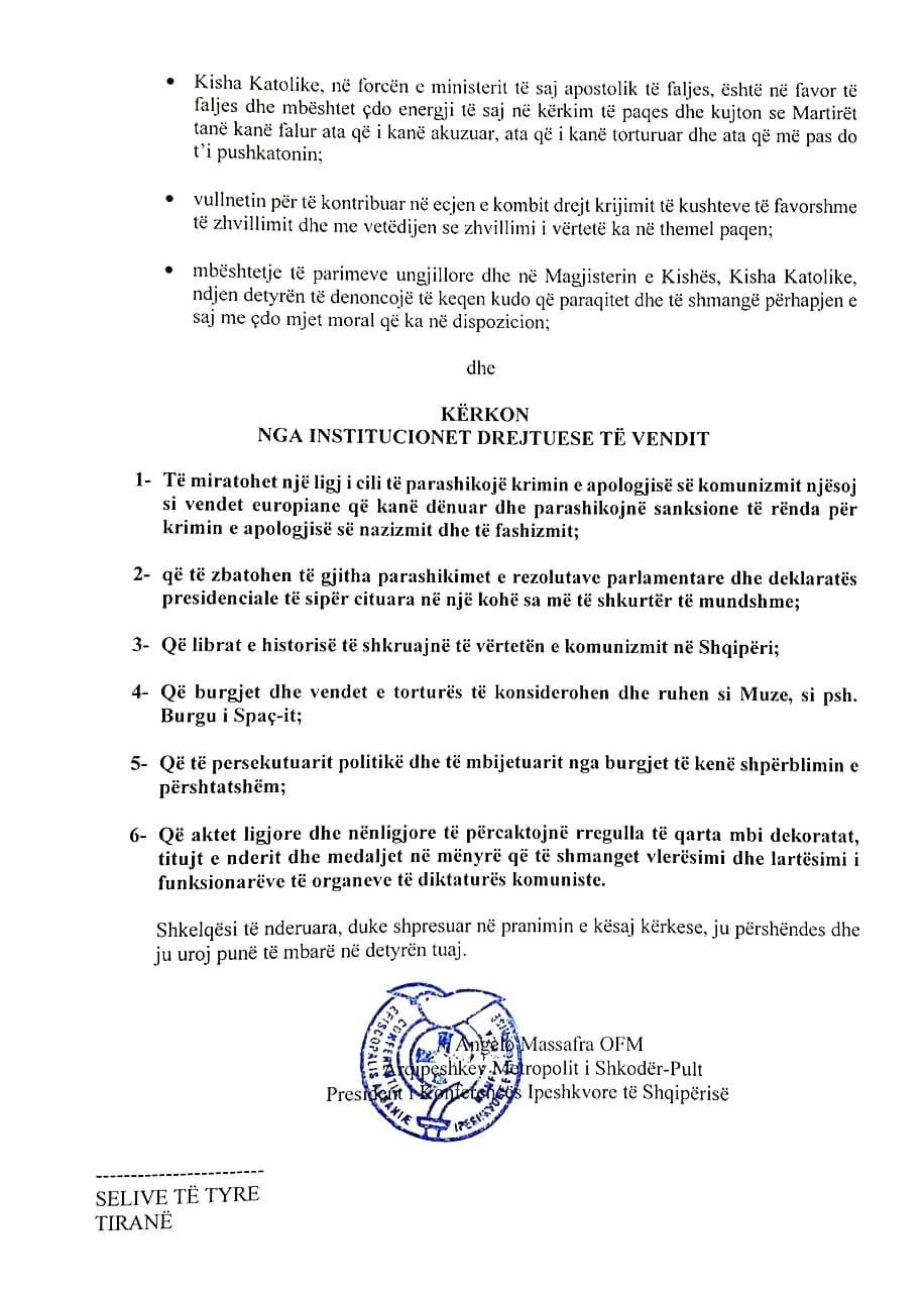 “Nuk mund të lartësohet një njeri që ka qenë shkaktari i shkatërrimit të kombit tonë”, përfundoi Monsinjor Angelo Massafra.