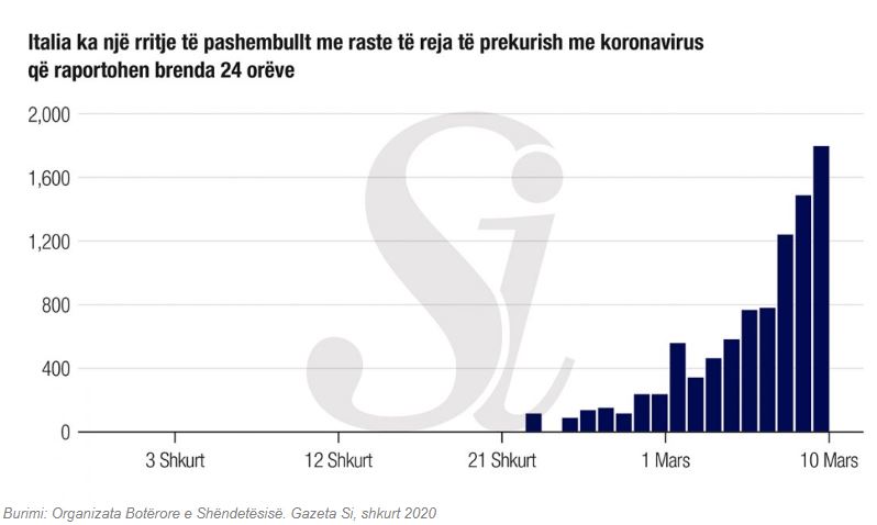 Nga grafiku i krijuar që prezanohet në krye të shkimit, Gazeta “Si” vuri re se në ditën e 19-të ka një kapërcim të theksuar të rasteve me Covid-19 si në Kinë ashtu dhe në Itali. Në Kinë numri i të infektuarëve nga dita e 7-të në atë të 14-të është gati dyfishuar e po kjo situatë e ngjashme shumëfishimi është vënë re e në Itali ku numri është gati dhjetëfishuar.