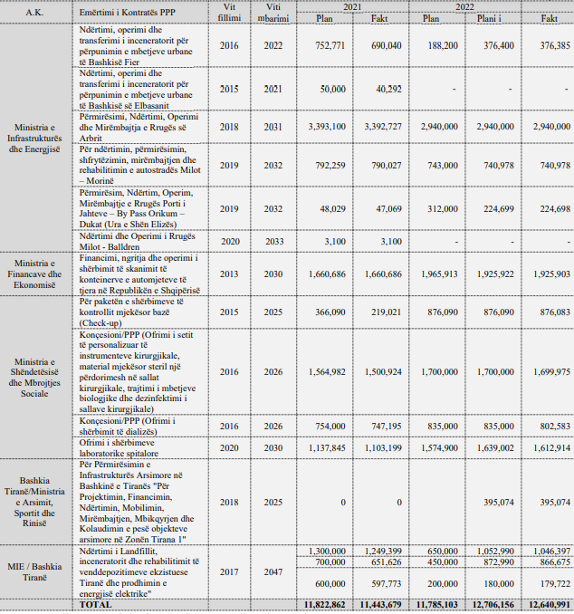 Sipas raportit të buxhetit faktik 2022, të detajuara sipas kontratave respektive plani dhe pagesat për kontratat koncesionare/PPP aktualisht në zbatim paraqiten si më poshtë: