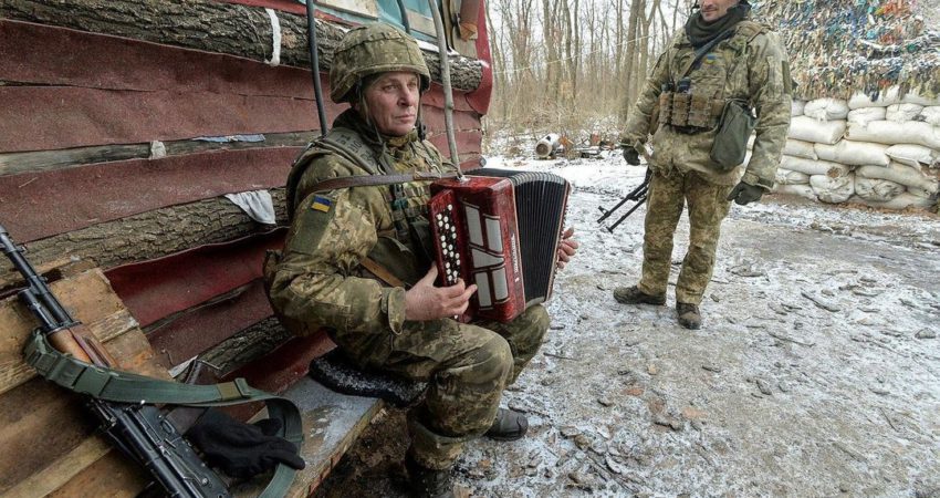 Një ushtar ukrainas luan me firzamonikë ndërkohë që “pret” të luftojë. /Reuters