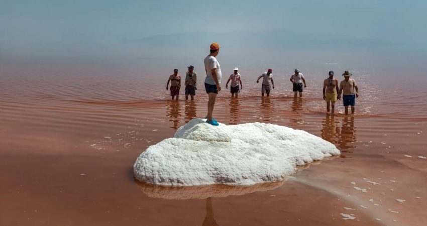 Një grup pensionistësh nga qyteti i Tabrizit në Iran ecin në ujin e kripur të liqenit Urmia.-Fotografi nga Magnum-The Guardian-29.06.2022.