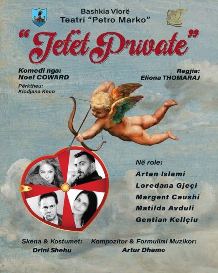 “Jetët private” është komedia e autorit britanik, Noel Coward, përkthyer nga Klodjana Keco që regjisorja Eliona Thomaraj do ta sjellë për publikun në një koncept e trajtim fin. Vepra do të vijë me një kast aktorësh profesionistë, ku në role janë Artan Islami, Loredana Gjeçi, Margent Çaushi, Matilda Avduli e Gentian Këllçiu.